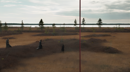 Ещё один сильный пример — сцена с девушкой и Лосем, снятая в отражении болота. Мы слышим, как на девушку наводят порчу, и Лось, как хтоническая сущность в поверьях народа мари, выступает исполнителем злой воли — заманивает героиню в чащу. Сцену смерти не показывают, но этот кадр вбирает в себя весь нарратив эпизода и даёт понять, что будет дальше.
