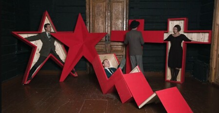 Ещё один частый приём — использование нарочито картонных, плоских и простых декораций, как будто их только что забрали с детского утренника. Такие декорации могут сочетаться с ритмичной динамикой кадра — как, например, последовательное появление новых элементов в сцене с летающими собаками в «Ангелах революции» (2014).
