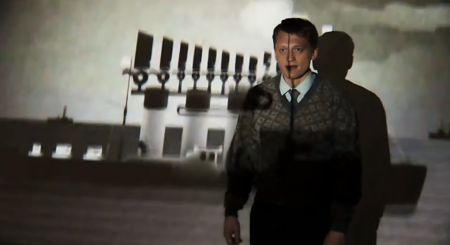 Так, на кадрах ниже эксперт рассказывает об устройстве космической ракеты, которой никогда не существовало, и этот рассказ визуально подкреплён со всех сторон: подпись «Московский физико-технический институт», интерьер кабинета, чертежи на состаренной бумаге, и, самое главное — молодой инженер, играющий в GTA: San Andreas, культовую видеоигру того времени.