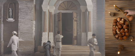 Кадры на таком экране не всегда меняются одновременно. Например, изначально сцены ниже транслировали нарративы церкви, пасхи, олицетворяя непорочность главного героя.