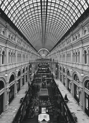 Ярким примером является Государственный Универсальный Магазин в Москве. В нем трехэтажные галереи с арочными пролетами и стеклянными крышами создают «город в городе». Рифленые аркады на каждом уровне формируют ясный ритм, направляя поток людей мимо витрин. Чугунные колонны с ажурным литьем визуально облегчают конструкцию, превращая утилитарный торговый пассаж в роскошное общественное пространство.