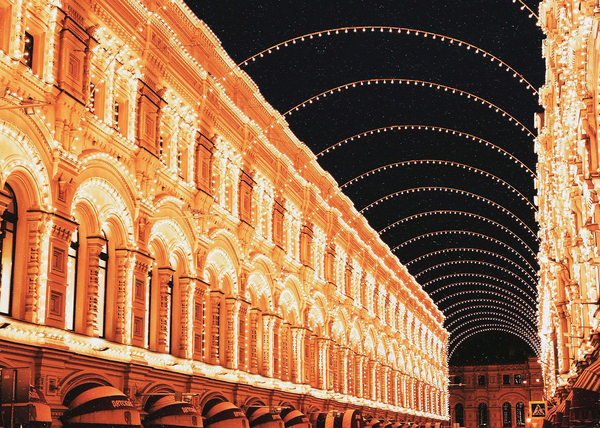 Аркады ГУМа транслируют идею доступной роскоши — приватное коммерческое пространство становится публичным форумом, где архитектура через масштаб и ритм создает атмосферу праздничного равенства.