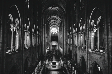 Другой мистический проект, который захватывает дух — это собор Парижской Богоматери (Нотр-Дам де Пари). Двухуровневая система арок главного нефа формирует сложный ритмический рисунок. Нижний ярус представляет собой мощные пучковые колонны, визуально отделяющие центральное пространство от боковых нефов. Второй уровень — ажурные галереи-трифории, создающие эффект проницаемой стены. Вертикальный ритм, усиленный нервюрами сводов, направляет взгляд по диагонали вверх — от входа к алтарной части.