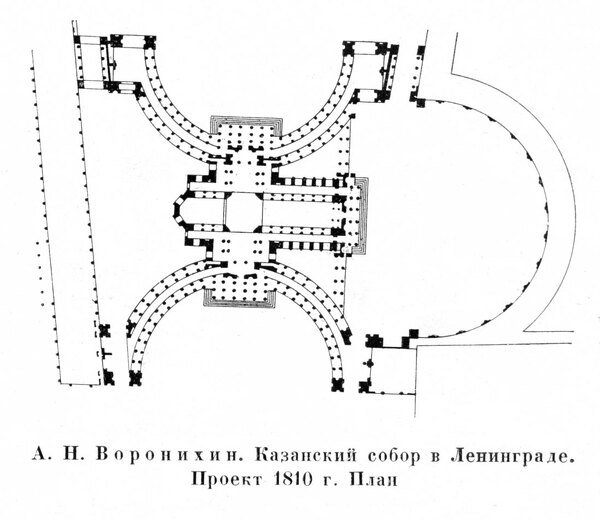 Конструкция колоннады вызывает ассоциации с собором Святого Петра в Риме. Однако Воронихин переосмысливает римский прототип. Если в Риме колоннада замыкает площадь, то в Петербурге она открывается к магистрали.