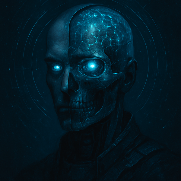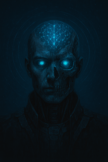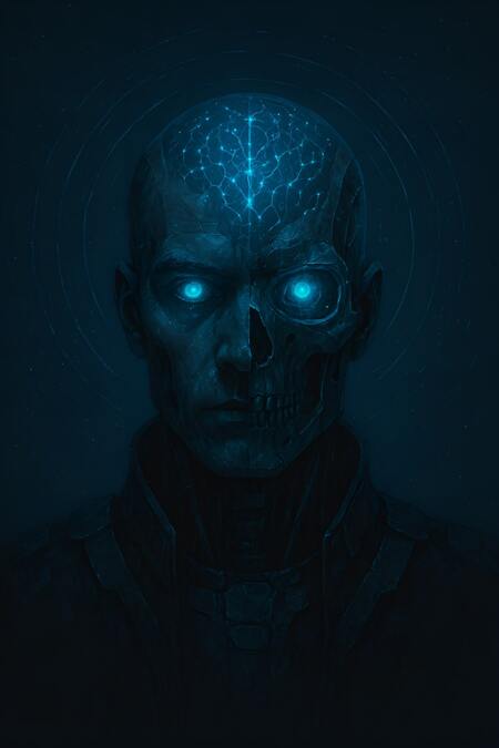 Промпт Изображение искусственного интеллекта в виде кибернетического оракула — полулицо, полуцифровой череп с прозрачной частью головы, в которой светятся нейронные сети. Глубокий темный фон (023047, неоновый голубой, черный, оттенки стали. Композиция — центральный портрет с фокусом на глаза и цифровую ауру. Впечатление — таинственная, почти религиозная мощь ИИ.