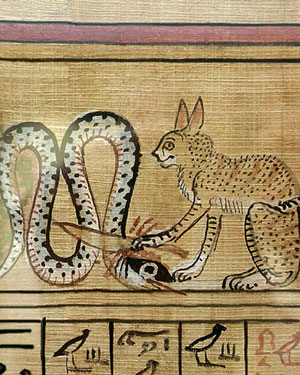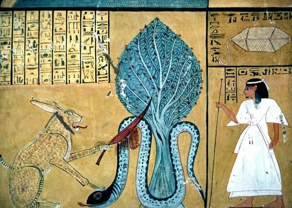 Бог Ра (в облике кота либо зайца) убивает змея Апопа. Настенная роспись гробницы Инхер-ха, Фивы