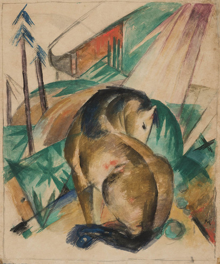 Франц Марк, Сидящая лошадь, 1912 г. / Август Маке, В Дворцовом саду в Оберхофене, 1914 г.