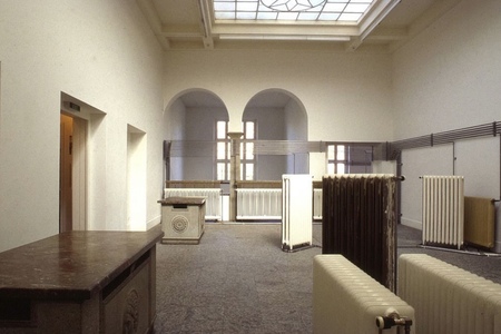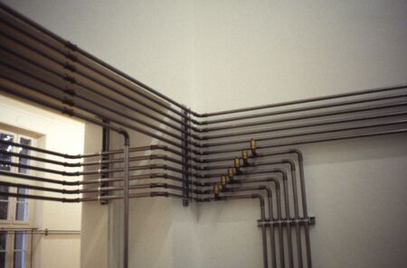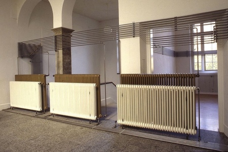 В 1992 году в Kunsthalle Bern Майкл Эшер превратил техническую инфраструктуру учреждения в само произведение: он удалил радиаторы из всех выставочных залов и разместил их в единой композиции во входном пространстве галереи. Металлические трубы пролегали вдоль стен, создавая линейные направления и визуально маркируя потоки тепла и воздуха — то есть невидимую систему музея. Таким образом Asher осуществил двойной ход: с одной стороны, он вывел на поверхность элемент, обычно остающийся за кулисами функционирования институции; с другой — сделал посетителя участником ситуации, где система отопления стаёт объектом восприятия. Работа смещает фокус с экспонируемого контента на само устройство галерейного пространства и на непрерывный процесс перераспределения ресурсов и энергии.