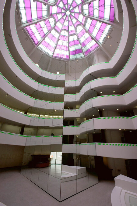 Отдельно хочется отметить работы ‘Around the Corner’ и ‘The Rose Window’, которые Даниель Бюрен создал в 2005-м году в здании музея Соломона Гуггенхейма в Нью-Йорке. Само здание было спроектировано и построено архитектором Фрэнком Ллойдом Райтом. Райт являлся ярым противником концепции «белого куба» и сравнивал подобные помещения с «моргом». Свое представление о том, как должно выглядеть выставочное пространство, он отразил уникальной спиральной многоэтажной конструкции.