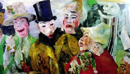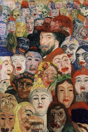 У Энсора маска — не средство сокрытия, а метафора пустоты и хаоса общества. Джеймс Энсор изображает мир как нескончаемый маскарад. Его персонажи носят маски, потому что лица утратили индивидуальность. Маска становится символом социальной пустоты.