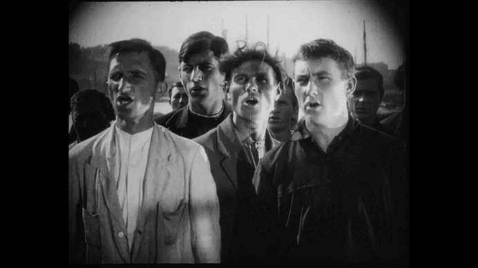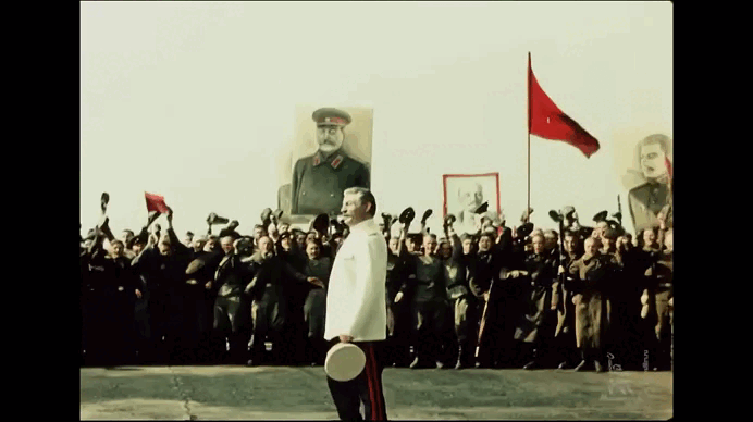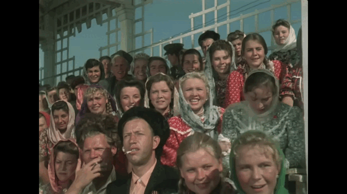 В кинематографе сталинской эпохи визуальный язык фиксирует принципиально иную модель: масса изображается как гармоническая, упорядоченная, идеальная форма. Массовые сцены строятся фронтально, симметрично, с высотных ракурсов, создающих образ «единого тела», в котором индивидуальность растворяется. Финалы — хоровые, коллективные, торжественные — подчеркивают отсутствие личной траектории, заменённой идеологическим общим движением. Здесь массовое полностью подчиняет индивидуальное: оно становится не пространством драмы, а символом политического единства.