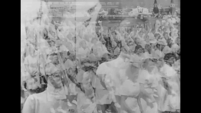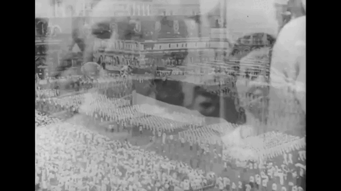 Масса как ритмически организованный поток, в котором многократные монтажные серии превращают повседневные действия множества людей в единый кинетический организм. Синхронность — попытка показать рождение нового типа субъекта, который существует в системе согласованных действий.