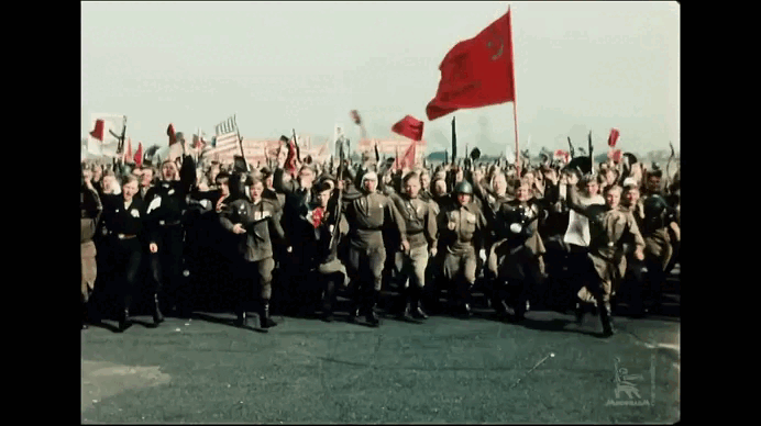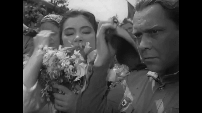Возвращение Алёши и Наташи происходит на фоне панорамы парада, символа коллективной радости, и эта личная история влюблённых также растворяется в триумфальном тоне, подчиняя частную жизнь политической. Толпа играет роль всеобщего одобрения, а фигура лидера является фокусом всего кадра.