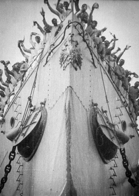 Индивидуальный жест запускает движение массы, но сразу растворяется в общем импульсе. Массовая сцена организована как единое тело: ритмические ряды матросов, синхронность движения, монтаж, превращающий множество лиц в коллективную эмоцию.