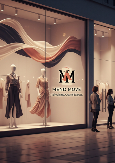 Gemini: Dynamic and elegant design. Flowing streaks of soft beige, black, and muted terracotta light form abstract shapes, symbolizing transformation and motion — the essence of MEND MOVE. A modern city fashion district at dusk, glowing with creativity and sophistication. Minimalist storefronts with artistic window displays, mannequins in unique designer outfits, and soft ambient lighting reflecting off glass surfaces. Silhouettes of stylish people walking, interacting, and expressing individuality. Subtle textures of fabric and movement blend with the warm light. The ‘MEND MOVE’ logo is prominently displayed, with the tagline: ‘Reimagine. Create. Express.’