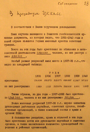 1 — подписанный протокол на ссылку в связи с обвинением в статье 58. 2 — документ, наглядно показывающий количество расстрелянных в период Сталинского террора 1937-1940.