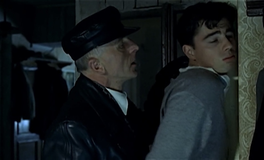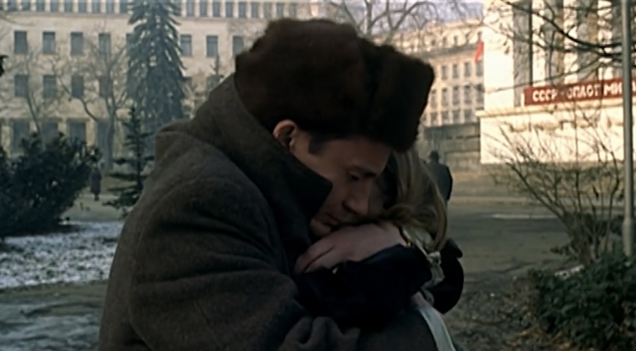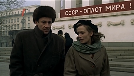 На протяжении всего фильма «Восток-Запад» кадры построены так, что за героями постоянно следят. Все друг за другом наблюдают, подслушивают друг друга и как будто то и норовят зацепиться за малейшую оплошность и донести на человека. Суровые, пристальные взгляды, направленные на героев со всех сторон дают нам понять — один неверные шаг и можно считать, что прошлой жизни пришел конец. Такая напряженная атмосфера передается и зрителю — к середине фильма мне уже самой казалось, что я наблюдаю за происходящим как бы скрытно, из-за угла. Вечные давление, стресс, страх, оказываемые на психику — это не ужасы, для вернувшихся эмигрантов это являлось каждодневной реальностью.