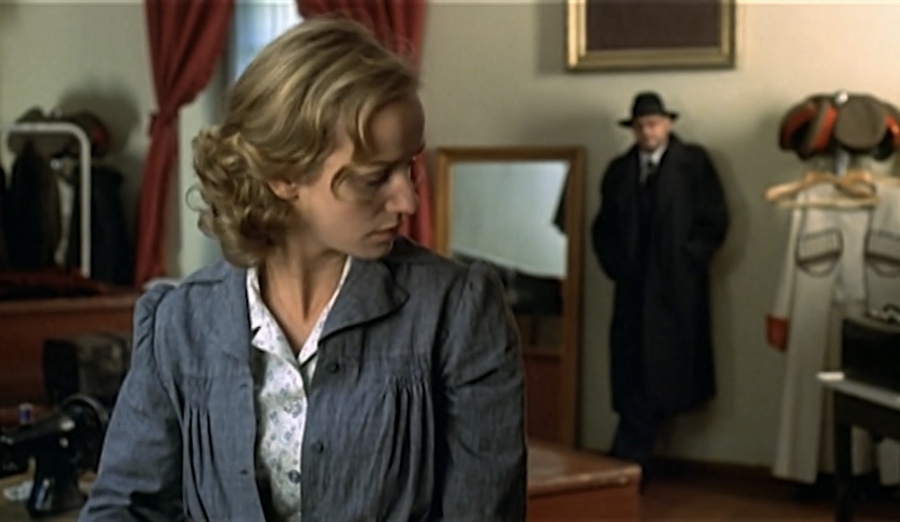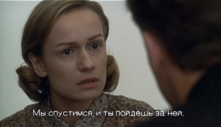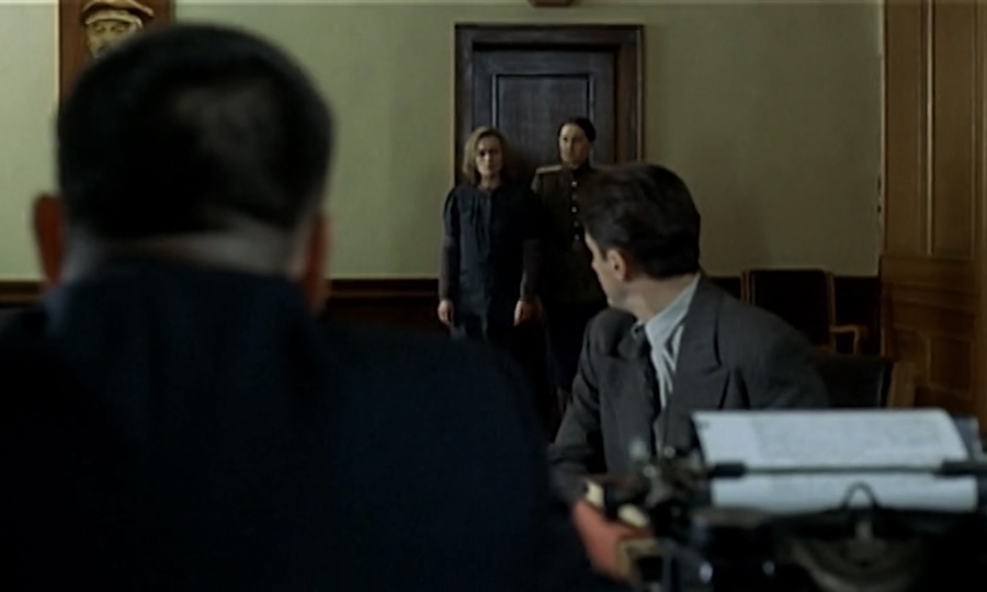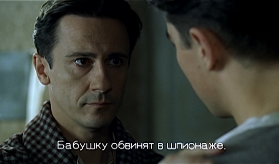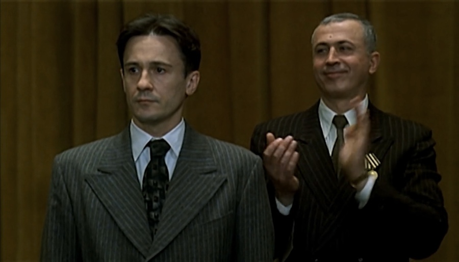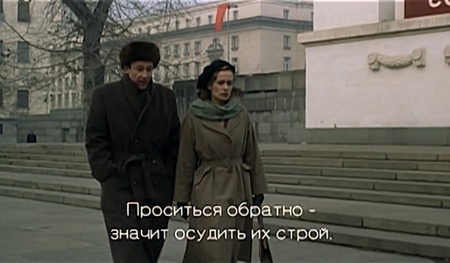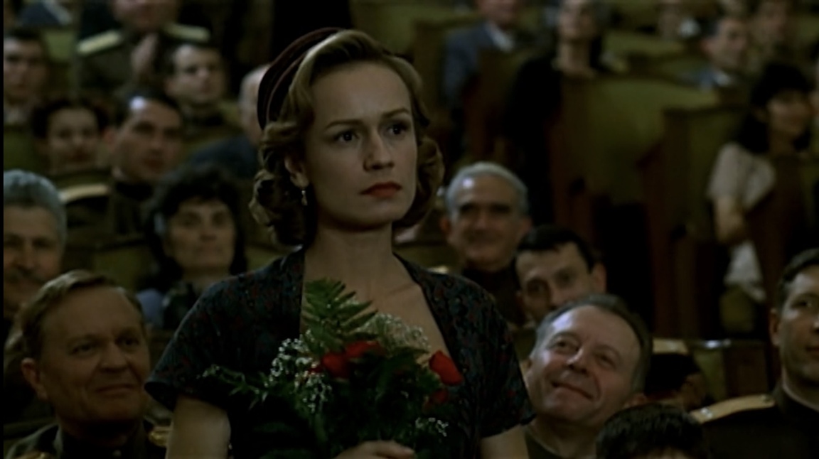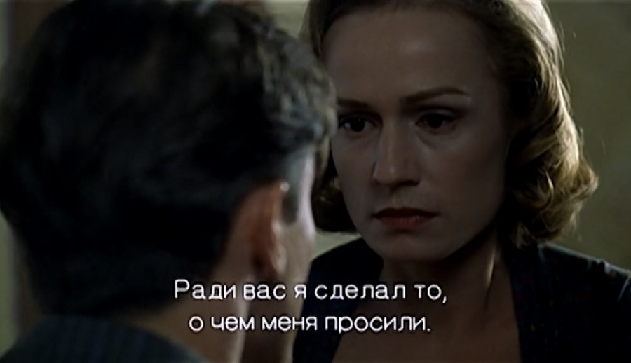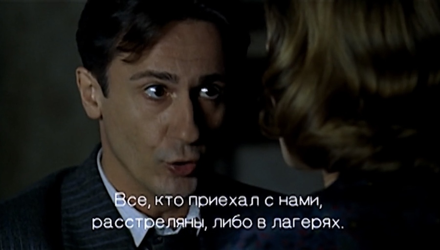 На данных кадрах мы становимся свидетелями того, как система и режим подавляют, ломают характер людей, заставляя поступиться их своими моральными устоями. Под страхом наказания или угрозы своей семье Алексей вынужден на сцене произнести благодарственную речь, обращенную Советскому Союзу, поблагодарить за радушный и теплый прием его семьи, что, конечно абсолютно расходилось с реальностью. Мари по сюжету обвиняет Алексея в предательстве, но вот тут и кроется ответ на ее обвинения — ее муж действительно был загнан в угол, так как ему был поставлен ультиматум. Более того, Алексей рассказывает жене, что практически все, кто прибыл в Россию вместе с ними, либо расстреляны, либо в лагерях. Таким образом, мы выделяем тенденцию того времени — если хочешь быть на свободе, то нужно либо молчать, либо говорить то, что требует повестка. Отказаться от этого означало бы подвергнуть угрозе и опасности не только себя, но и всю свою семью.