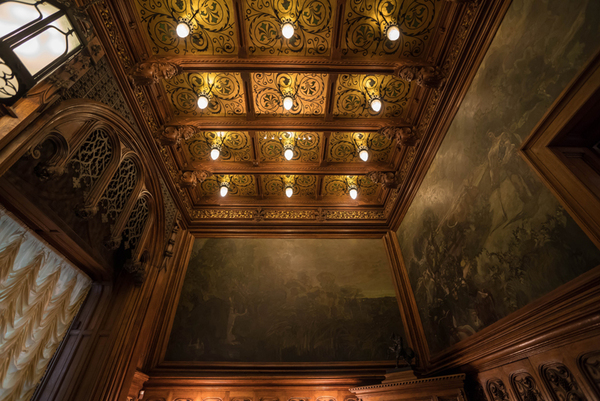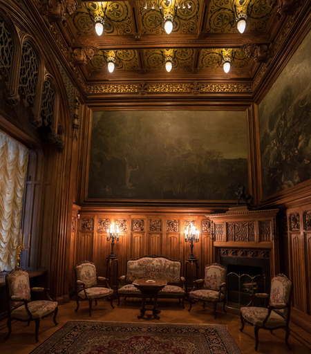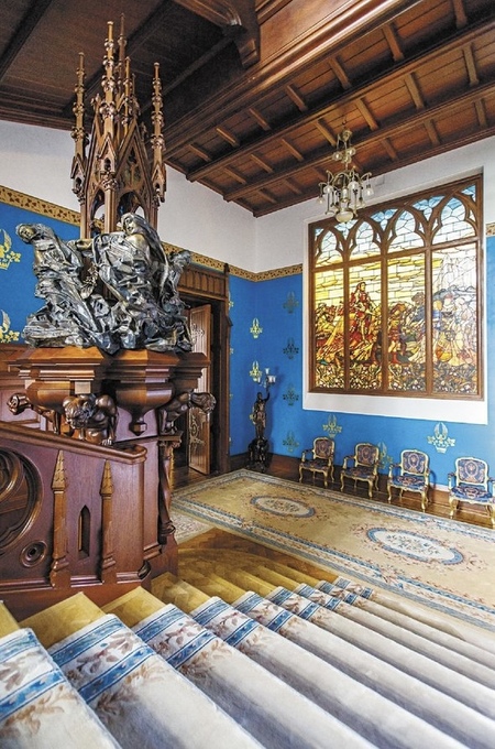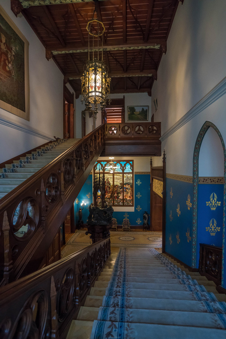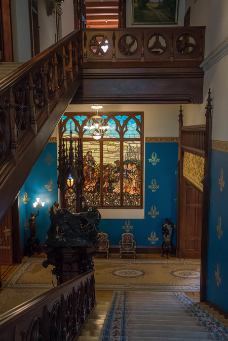 Расположенный в нише напротив лестницы витраж «Рыцарь» усиливает драматичность и динамику пространства входной группы. Яркие переливы стекла отбрасывают цветные блики на лестницу, что дополняет и подчеркивает деревянные перила и скульптуру с готическим фонарем.