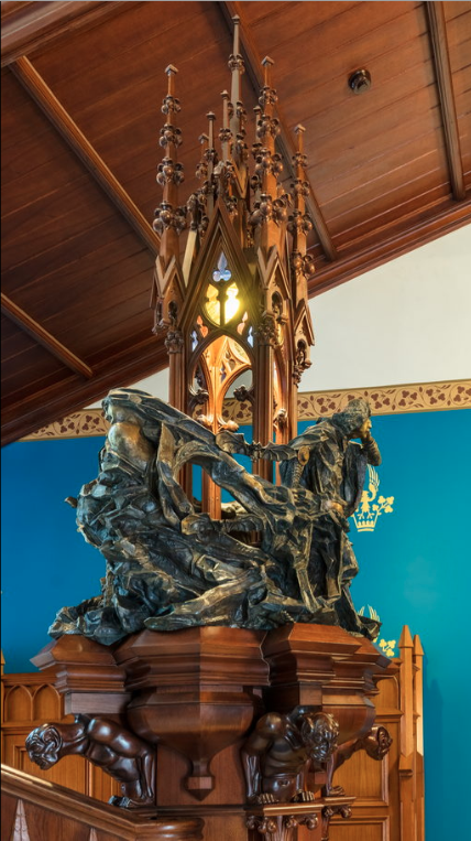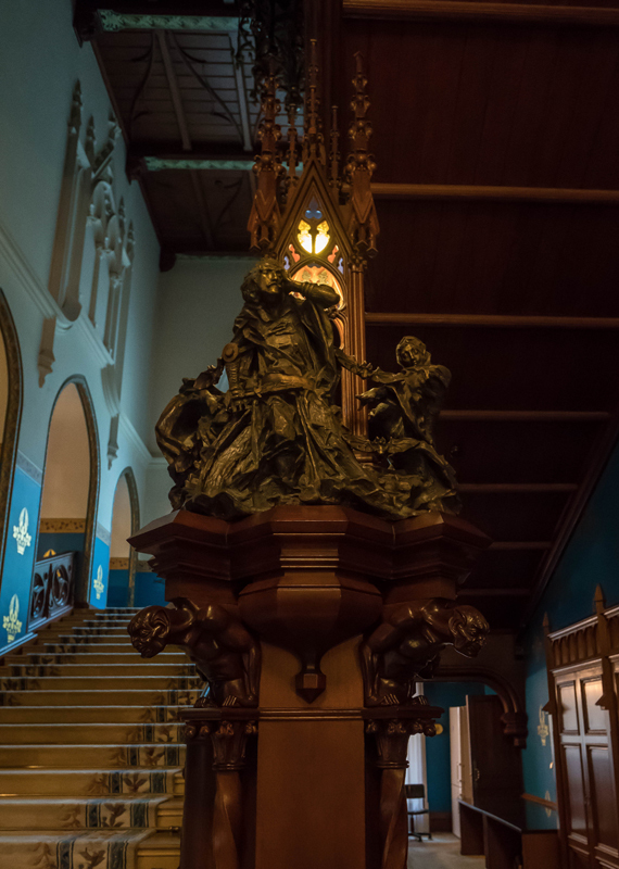 Динамичная поза героя, кружащие вокруг монахини, крайне экспрессивные и гротескные выражения лиц в совокупности придают скульптуре оттенок мистицизма и дополняют готический интерьер.