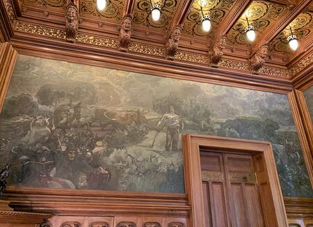 «Утро» репрезентуют нимфы и русалки, пробуждающие природу, в «Полдень» пахари выходят в поле, олицетворяя пик жизни, а так же отражая мотив труда. На панно «Вечер» художник изображает средневековый сюжет — главным героем, как и на витраже около лестницы, становится рыцарь. Однако он только уходит в бой, что навевает печальные мысли о закате бытия.