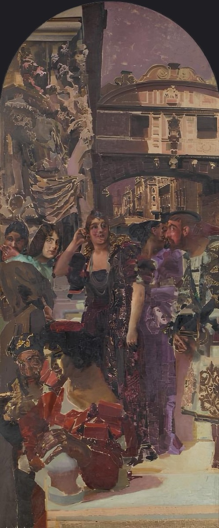 Вместе с триптихом «Суд Париса» была отклонена и идея о панно «Венеция». Живая композиция, костюмы и герои картины также сообщают о реминисценции эпохи Возрождения. Колорит панно, переливание пурпурного, бирюзового и охристых оттенков наполняет картину духом праздненства и торжества, что отлично отражало бы благополучие хозяев особняка, для которого первоначально и задумывалась работа.