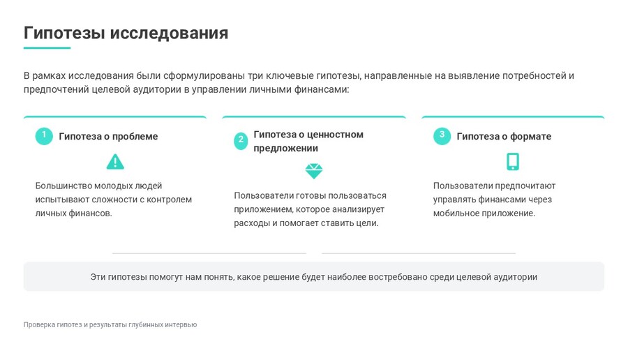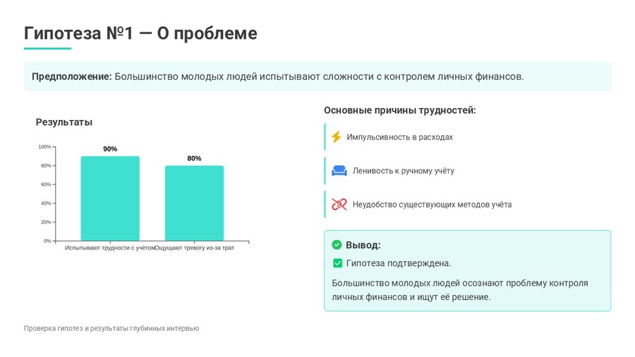 На первой неделе я пришёл с очень расплывчатой идеей — «хочу сделать что-то про личные финансы». По заданиям курса я разложил её на конкретные гипотезы: кому это нужно, какую боль решаю, какой результат человек получит. Сначала я составил список ключевых гипотез (на слайде видно, как я их выписал), а потом начал проверку. Я провёл интервью с потенциальными пользователями: спрашивал, как они сейчас ведут бюджет, что им неудобно, что они уже пробовали.