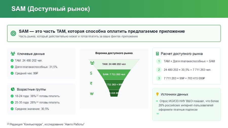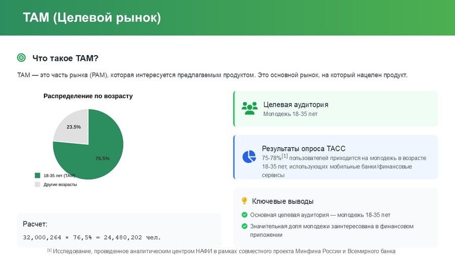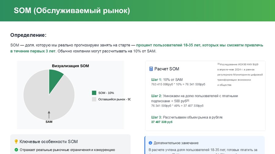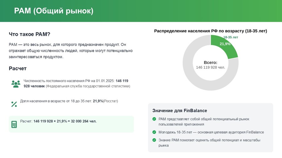 На второй неделе я впервые посмотрел на идею как на бизнес, а не просто «полезное приложение». Я посчитал рынок: сначала общий масштаб (PAM), потом целевой сегмент (TAM/SAM), а дальше — реальную долю, которую можно занять на старте (SOM). Это дало понимание, что аудитория у FinBalance большая, и продукт точно не «для десяти человек».