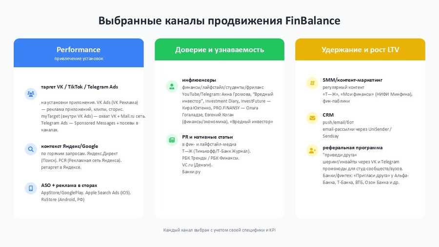 Я расписал какие каналы тестировать первыми: таргет в соцсетях, блогеры по теме финансов, контент-маркетинг и партнёрства. Дальше посчитал расходы на каждый канал и прикинул CAC — сколько стоит привести одного пользователя.