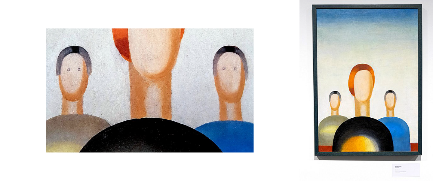 1. «Три фигуры». Анна Лепорская, 1934 г. фрагмент после нападения вандала. (декабрь 2021 г.) 2. Картина до повреждения (ноябрь 2021 г.)