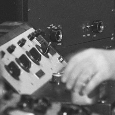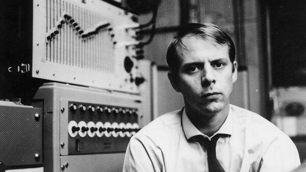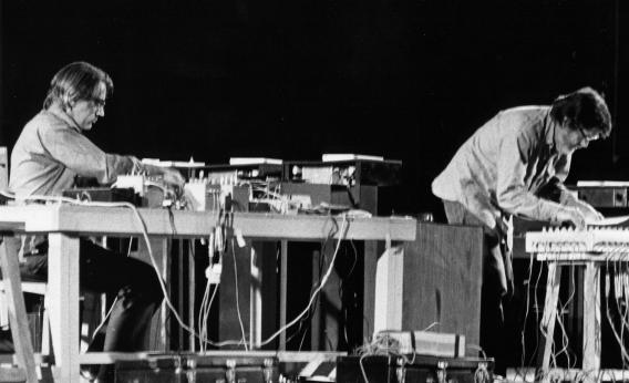 Джон Кейдж (справа) и Дэвид Тюдор (слева) за столами live electronics, ок. 1960-е: импровизационная работа с контактными картриджами, микшерами и самодельными схемами.