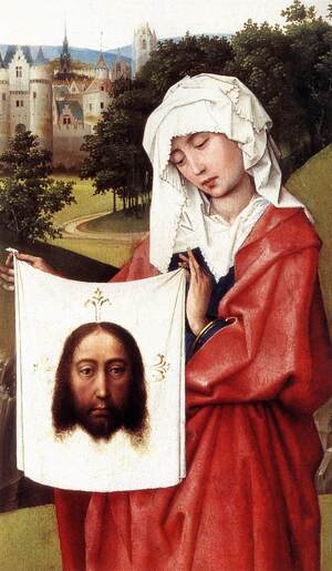 Вероника — один из самых значимых элементов композиции, несмотря на то, что стоит сбоку. Во-первых, её плат с ликом Христа работает как второй уровень изображения: это «образ внутри образа». Благодаря этому зрителю показывают не только сцену распятия, но и сохранённый след страдания, визуальную «память», которая не исчезает. Во-вторых, Вероника — это посредник между сценой и зрителем. Она держит убрус почти фронтально, то есть предлагает его нам напрямую. Её присутствие смещает акцент с самого момента страдания на его запечатлённый образ, что характерно для позднесредневековой культуры, где реликвии играли важную роль в личной духовности.