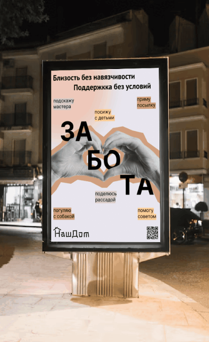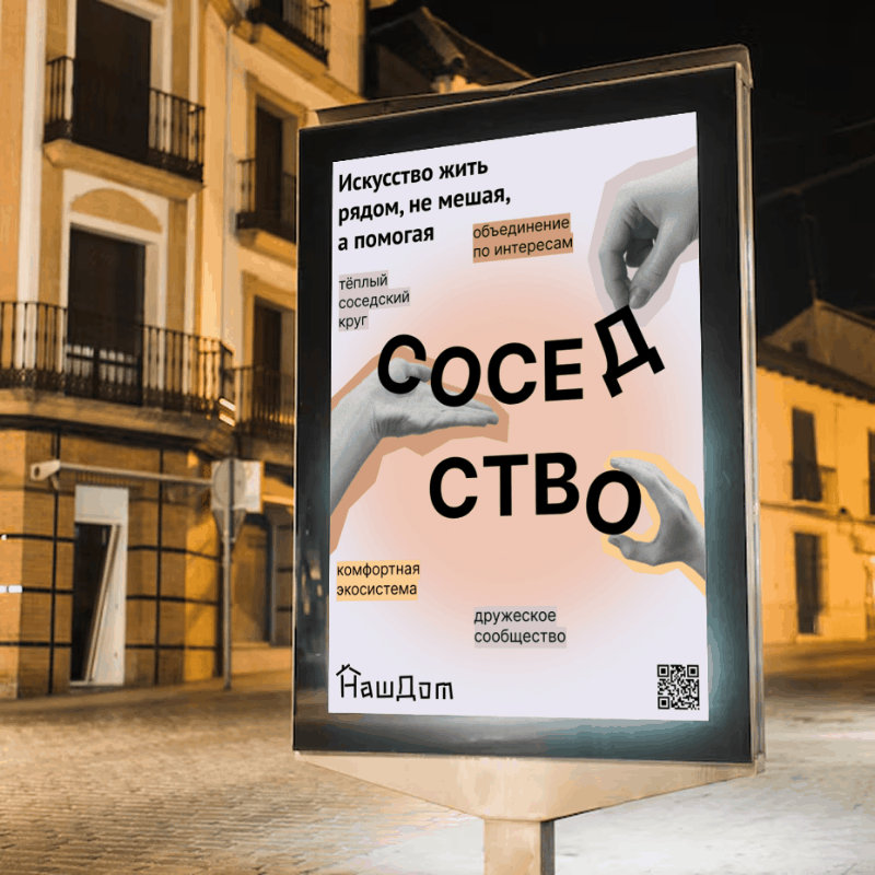 Создана с использованием фотографий рук, через привычные для каждого жесты отражает грани добрососедства, которые помогает развивать НашДом, акцентирует внимание на важности общности соседей.