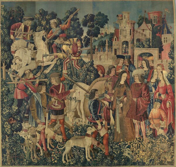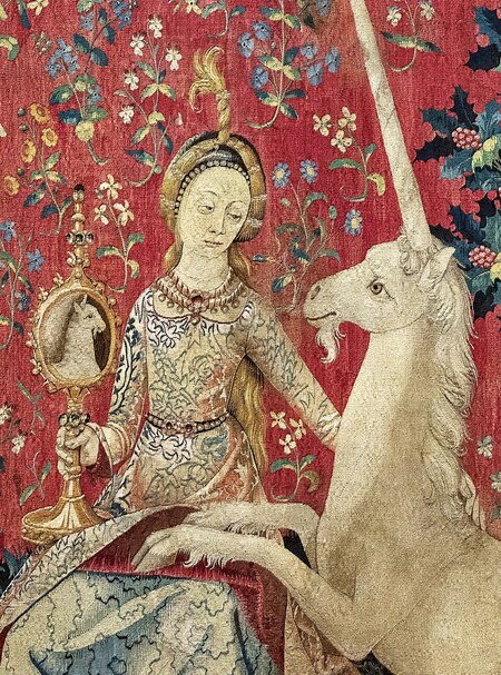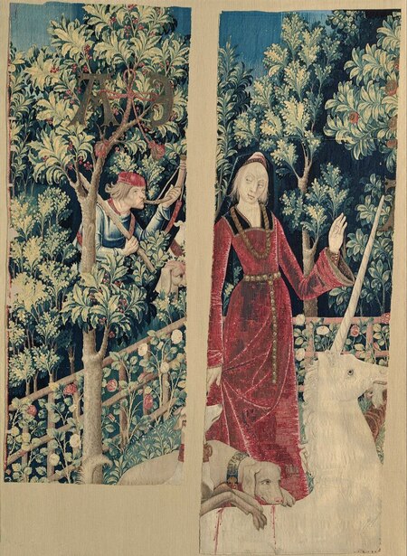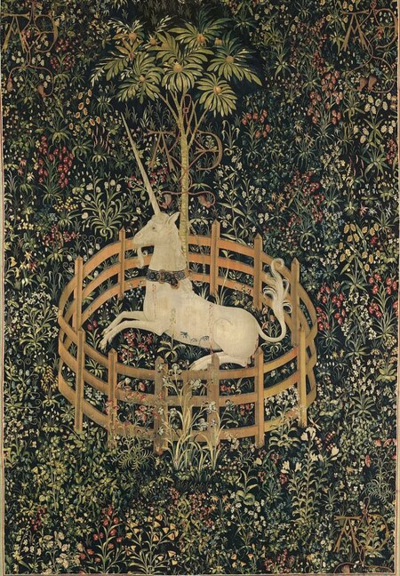 Еще одним примером грандиозных шпалер, в которых внимание уделяется образу единорога, является серия работ «Дама с единорогом», созданная в 1484–1500 годах. Сейчас данные гобелены называют «гордостью парижского музея клюни».