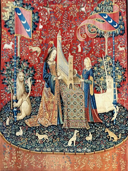 «Слух» Шпалера из серии «Дама с единорогом». Клюни, Париж (1484-1500) / «Осязание» Шпалера из серии «Дама с единорогом». Клюни, Париж (1484-1500)