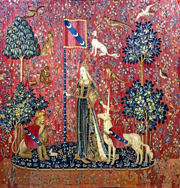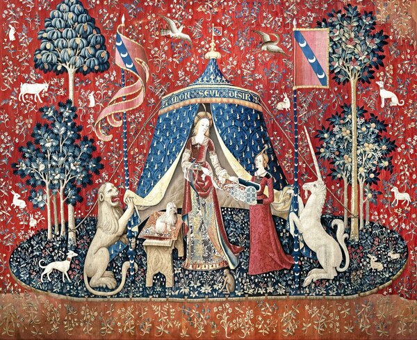 «Дама с единорогом» — цикл шпалер, пять из которых посвящены человеческим чувствам: «Вкус», «Слух», «Зрение», «Осязание», «Обоняние». В серии также участвует шестой гобелен, носящий название «По моему собственному желанию», считающийся самым загадочным из всех изображений. На нем девушка складывает ожерелье в ларец, который держит служанка. Предполагаемо, она отказывается от драгоценных украшений, что может отсылать нас к рыцарской куртуазной культуре Франции.