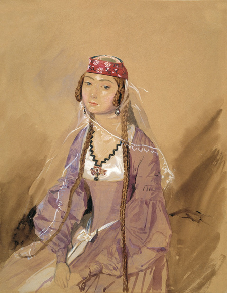 Портрет грузинки с русыми косами, ок. 1840 г., Г. Г. Гагарин / [Электронный ресурс] // Artchive: [сайт]. — URL: https://artchive.ru/artists/1858~Grigorij_Grigor'evich_Gagarin/works/643540~Portret_gruzinki_s_rusymi_kosami_18401841 (дата обращения: 22.11.2025).