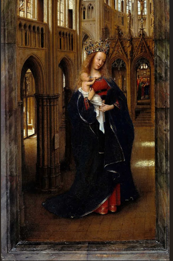 Однако образ Мадонны Яна ван Эйка — родоначальника ранней нидерландской школы Северного Возрождения — отличается от изображений его последователей. Привлекает практически полное отсутствие эмоций на ее лице, и она, и младенец представлены в спокойном, отрешенном, практически медитативном состоянии.