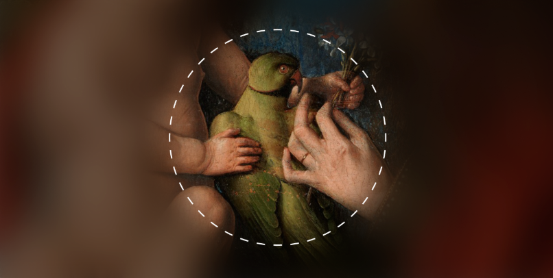 Особое место занимает попугай. Вообще, образ попугая на картинах ранних нидерландских художников амбивалентен. Он может олицетворять как доброе, так и злое начало. Но в данном случае, конечно, попугай символизирует добрые силы, благодаря тому, что средневековые люди слышали в криках попугая слово Ave, с которым в сюжете Благовещения к Марии обращается архангел Гавриил. Таким образом, попугай на картине символизирует благую весть Богоматери.