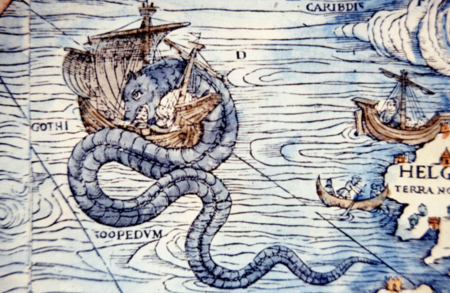 Большой морской змей. Как известно это существо было огромных размеров, из чего мы можем сделать вывод, что поведение во время нападения на корабль было следующим: змей обвивался вокруг, тянув людей и корабль на дно. На самой карте рядом с чудовищем корабля нет, можно сделать вывод, что мореплаватели знали о потенциальной опасности и редко появлялись в этом месте. Посмотрев на извивающуюся форму змея смею предположить также, что таким образом мореплавателей пытались предупредить о сильном течении в этом месте (хвост выходит из рукава) или о крутых, скалистых берегах, опасных пещерах. Возможно в реальности так изображали длинных рыб.