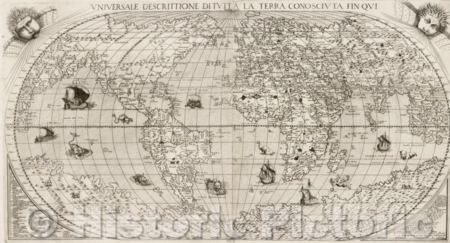 Карта Южной и Центральной Америки, созданная для испанской аудитории. Морские чудовища включают морских змей, гигантских рыб, драконов, а также элементы «чудовищ суши» (гиганты, каннибалы). Чудовища подчеркивают «неизведанность» и «экзотичность» Нового Света.
