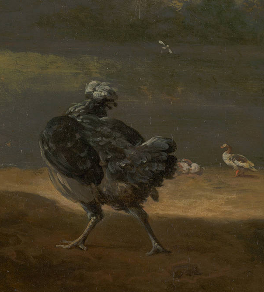 На заднем плане, почти на линии горизонта, Хондекутер оставляет несколько едва заметных уток. Они стоят спиной к всей шумной жизни переднего плана. Никакого взаимодействия: ни с петухами, ни с другими птицами, ни друг с другом. Они просто есть, как отдельный, тихий мир внутри одного холста.