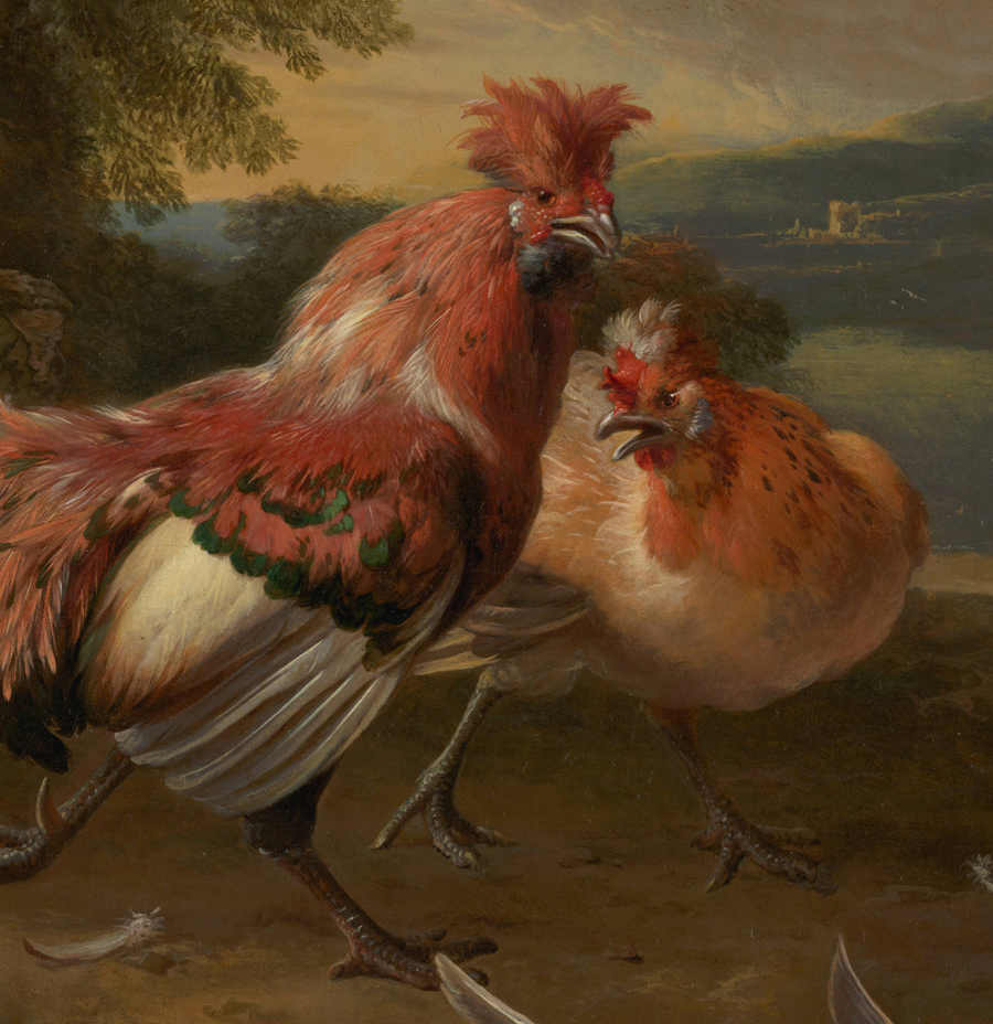 Таким образом, картина раскрывает свободу как многоуровневое и неоднозначное состояние: она существует и в динамичном взаимодействии, и в попытках сохранить собственное пространство. Свобода здесь отвоёвывается, но всегда остаётся частью живой среды. В крике петуха, в тревоге от вторжения собаки и в спокойной отстранённости уток проявляются разные её формы — от конфликтной до созерцательной. Хондекутер показывает, что свобода живых существ невозможна без напряжения и разнообразия, а гармония возникает именно там, где эти силы сосуществуют, пусть и хрупко.