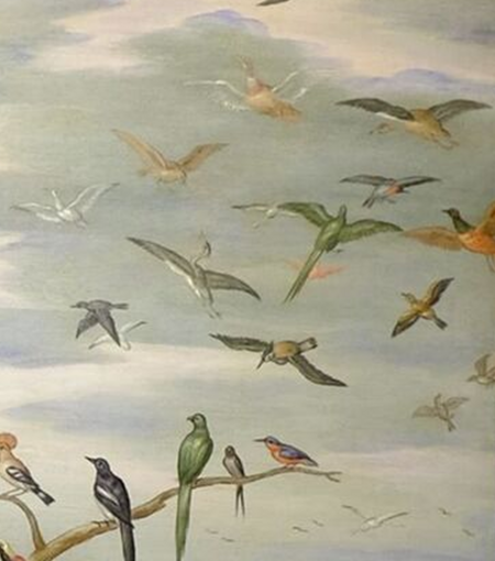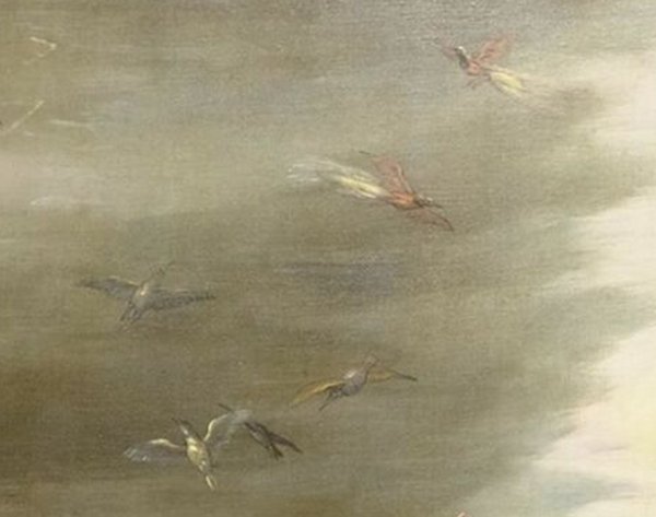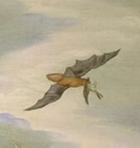 Среди птиц появляются летучие мыши, существующие на границе между привычной воздушной гармонией и скрытой угрозой. Особенно значим эпизод в правой верхней части картины, где одна из летучих мышей пожирает птицу прямо в полёте. Эта сцена словно прорезает спокойствие композиции, демонстрируя, что даже в естественной среде свобода постоянно соседствует с опасностью. Путь от воли к неволе может оказаться мгновенным буквально из-за одного движения хищника-врага.