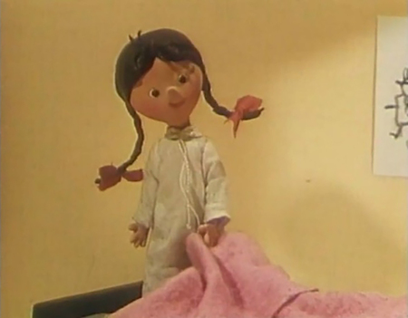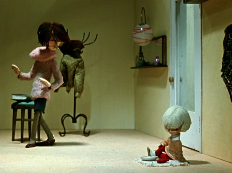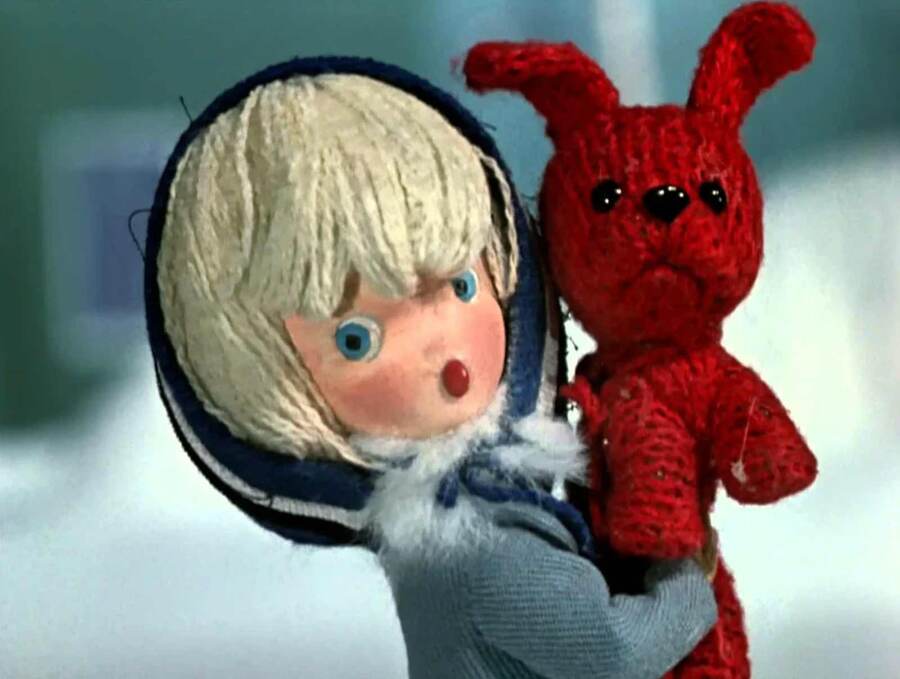 При этом дети на экране по-прежнему выглядят опрятно и миловидно — явного отказа от идеализации внешнего облика не происходит, скорее, происходит очеловечивание и индивидуализация. Девочки-персонажи перестают быть только условными «пионерками» с косичками — у них появляются разные прически, платья, они могут быть капризными или мечтательными, как, например, малышка в кукольном фильме «Варежка», которая выглядит как самый обычный ребенок в пальтишке и шапочке, играющий во дворе. Художники уделяют внимание детским аксессуарам и игрушкам: в том же фильме «Варежка» красная вязаная варежка превращается в воображении девочки в забавного щенка — эта деталь не только сюжетная, но и визуально выразительная.