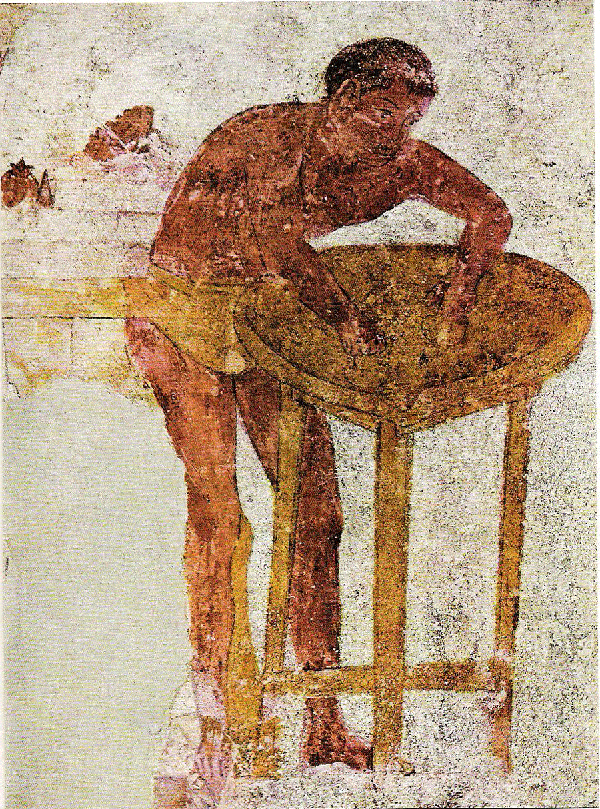 1.Servant cutting something (meat?) for the banquet, on a table with a drain, Golini Tomb, Orvieto 460 B.C Horse head, Francesca Giustiniani Tomb, Tarquinia, 5th century B.C.