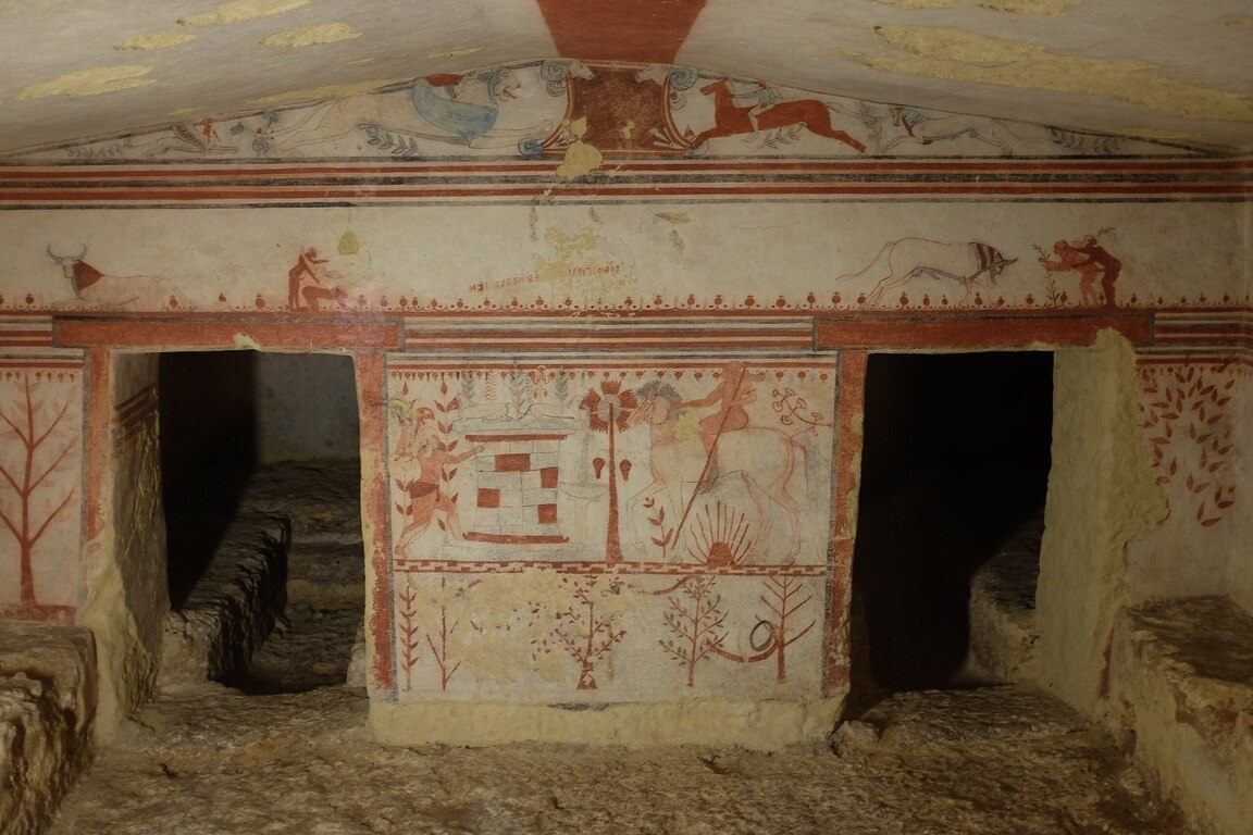 И, начиная тему с гробницами, конечно же, мы оказываемся в Гробнице Быков, находящейся в Монтероццинском некрополе вблизи Тарквинии. Её создание датируют около 540-х годов до нашей эры, и исследователи считают её одним из самых выдающихся памятников этрусской культуры. В этой гробнице присутствует несколько очень важных сюжетов.