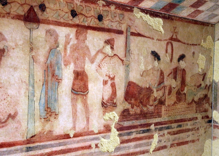 Очень важный и показательный пример, который я хочу привести при сравнении греческой и этрусской культур, это роль женщин в обществе и то, как эта роль отражена в искусстве. На этрусских фресках и саркофагах мы снова и снова видим мужчин и женщин рядом, в одинаково значимых позициях: они лежат бок о бок на пирах, участвуют в ритуалах и изображаются как равные.