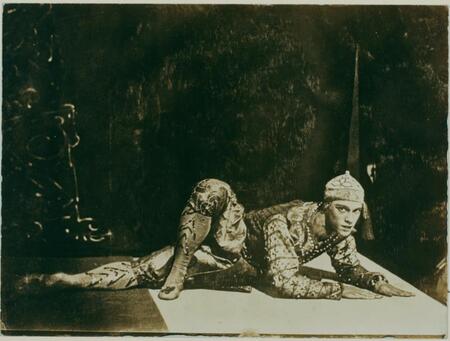 1 — Л. С. Бакст. Костюм для восточного танца В. Ф. Нижинского, 1917 2 — В. Ф. Нижинский в восточном танце, дивертисмент «Ориенталии», 1911