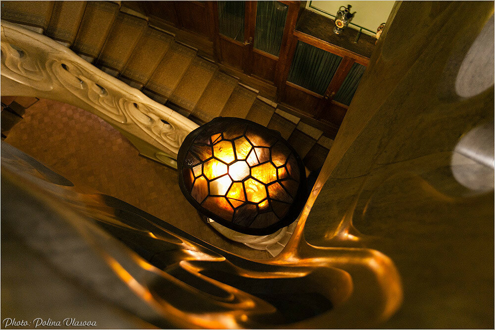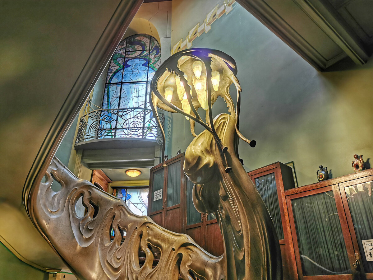 Лестница, подобная волне, завершает движение в колонне, которая служит опорой для лампы. Лампочки в ней спрятаны в декоративных элементах, напоминающих сталактиты или щупальца медузы. Этот барочный эффект, столь характерный для модерна, подчеркивает синтез живой формы и архитектурной фантазии, который стал отличительной чертой творчества Шехтеля. Черепаха — символ долголетия и мудрости в некоторых культурах, в том числе в мексиканской. Древние цивилизации майя и ацтеков строили сооружения с изображениями черепах, чтобы прославить мудрость и долголетие этого существа.